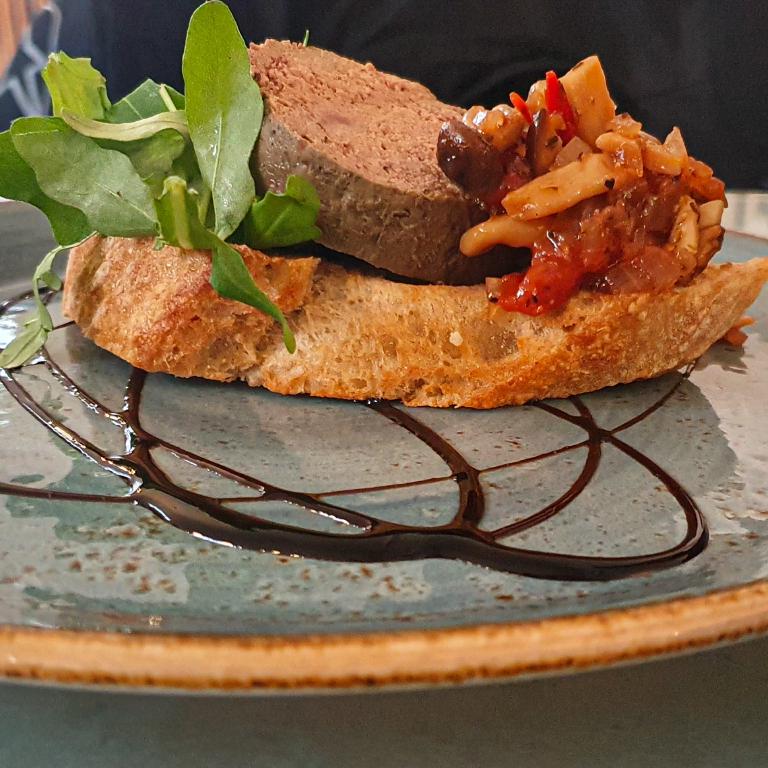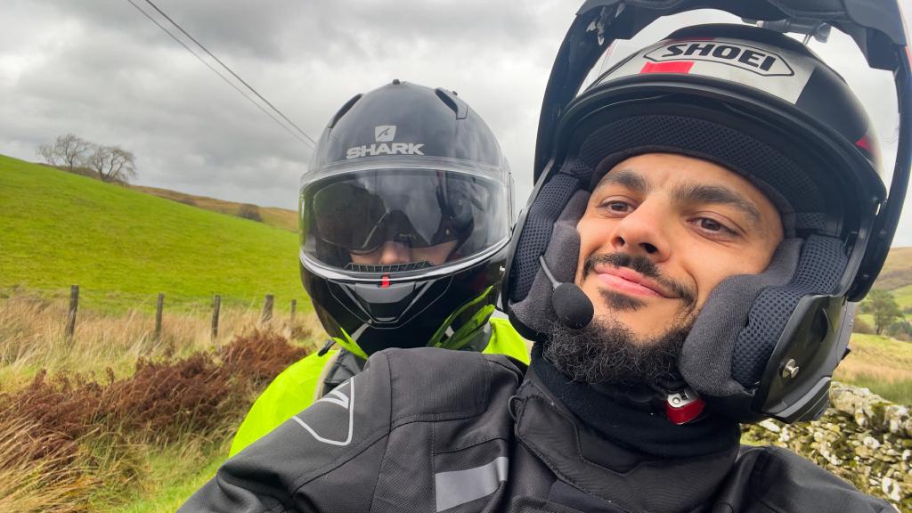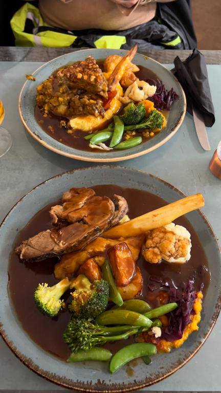 Helmets on, sync the audio and go. It took us about one hour and fifteen minutes to arrive at our next destination. The Pig Place is a great and different canalside camping and farm shop with a cafe serving breakfast and lunch. We grabbed a coffee and an egg and bacon sandwich. The coffee was great, and the sandwich was delicious. Beatriz, my wife, was enjoying a nice vegetarian breakfast. With a nice cup of coffee next to the canal.