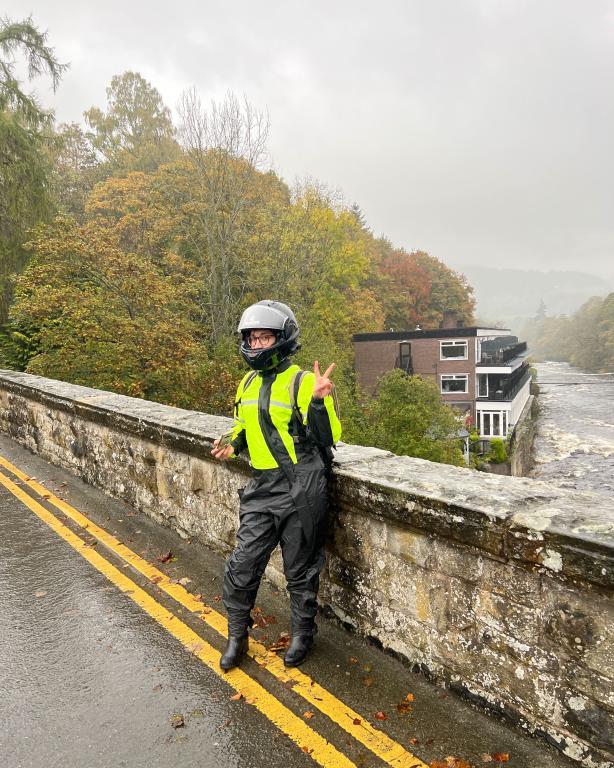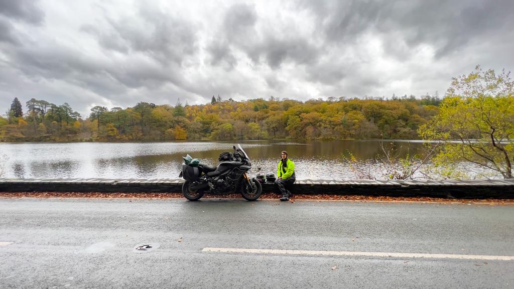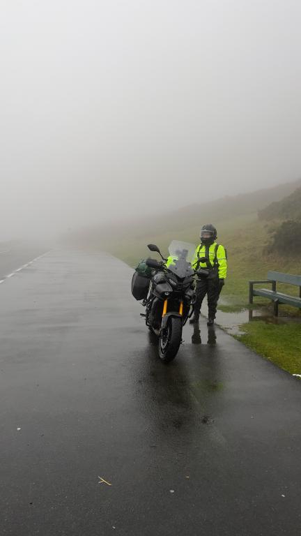 As we got closer to the viewpoint, the fog became thicker and thicker. There was also some rain, but very thin, just enough to fall through the dense fog. Riding in these conditions was unsafe; I turned the indicators on and rode slower than usual. After ten minutes in this fog, I couldn’t see in front of me for 100 yards. We had to stop. We were cold but not wet; the rainproofs kept the water out. There was a good investment if you ask me. Not the prettiest to wear, but it is the dryest of all other options.